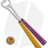This Barfly Pro Model is outfitted with purple and yellow handles, and a satin finished bottle opener.