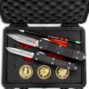 This custom Strider/Pro-Tech PT auto has a solid titanium frame with a tiger stripe finish by Strider and a Chad Nichols stainless Damascus steel blade. The PT collaboration revitalizes their popular SnG automatic model with a compact EDC design. The Strider inspired profile remains the same, but the handle and blade have been scaled down to a more pocket friendly size. A custom deep carry pocket-clip round out the impressive EDC design.