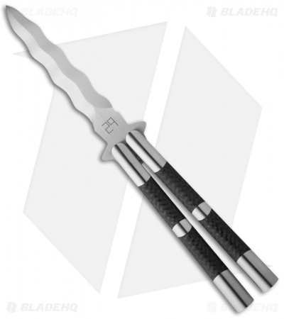 This Chris Olofson 29 Knives balisong features a double-edged 4″ Kriss style blade. The handle is 303 stainless steel with dove-tailed carbon fiber scales. Channel construction, latchless design. This is an impressive knife at any angle.