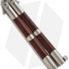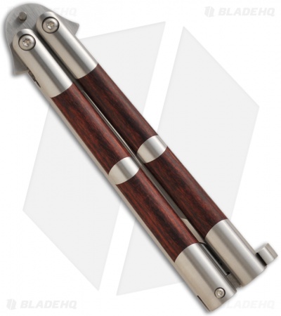 This Chris Olofson made balisong features a downswept chisel tanto blade with a sharpened top swedge. The 303 stainless steel handles have dove-tailed wood inserts.