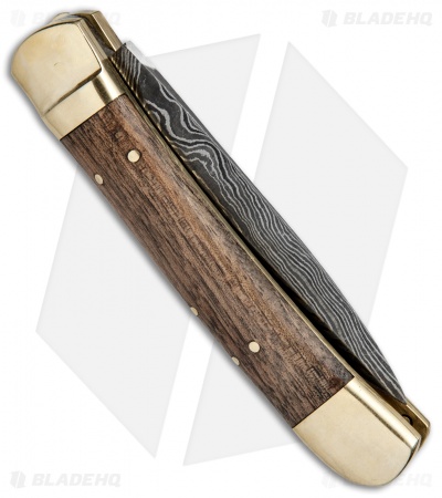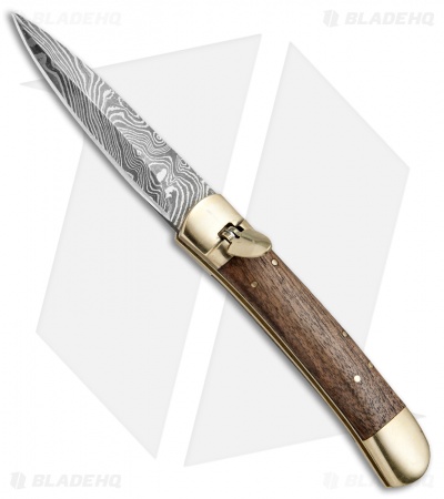 This Italian style leverlock stiletto is outfitted with dark wood handle scales and a damascus dagger blade. Brass bolsters and pins add a classic touch to the handle design with a convenient lever release for activating the automatic blade. The dagger blade is made from damascus steel with a plain edge. A stainless steel backspacer with impressive filework finishes off the collectible design.