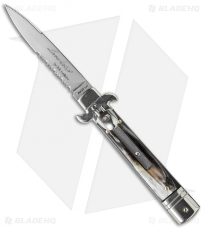 This 7.5″ Italian Stiletto from AKC comes in the Leverletto style with a Brazilian horn handle and a flat grind blade with a partially serrated edge. AKC specializes in collectible Italian stilettos made with traditional knife-making techniques. This Bill DeShiv’s designed Leverletto model has a Brazilian horn handle with a stainless steel bolster. Brass pins add a classic finishing touch to the design. The blade comes in a drop point style with a plain edge and a satin finish. Add classic Italian style to your collection with the AKC 7.5″ Leverletto stiletto.