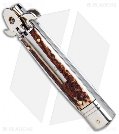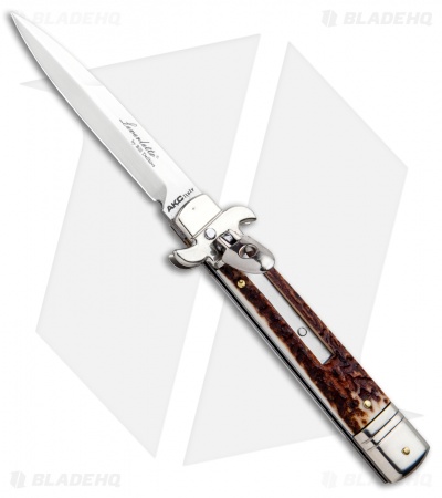 AKC Leverletto 7.75″ Lever Lock Auto Italian Knife Stag (3.25″ Satin Bayo)