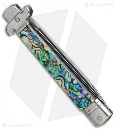 This 9″ Italian Stiletto from AKC comes in the leverletto style with an abalone handle and a bayonet blade. AKC specializes in collectible Italian stilettos made with traditional knife-making techniques. This 9″ Leverletto model has an abalone handle with a sturdy stainless steel liner. Brass pins add a classic finishing touch to the design. The blade comes in a drop point style with a plain edge and a satin finish. Add classic Italian style to your collection with the AKC 9″ Leverletto stiletto.