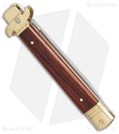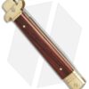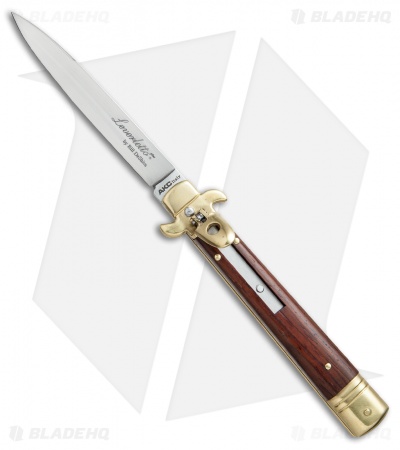 This 9″ Italian Stiletto from AKC comes in the Leverletto style with a cocbolo handle and a flat grind blade with brass bolsters. AKC specializes in collectible Italian stilettos made with traditional knife-making techniques. This 9″ Leverletto model has a cocobolo wood handle with a brass bolster. Brass pins and liners add a classic finishing touch to the design. The blade comes in a drop point style with a plain edge and a satin finish. Add classic Italian style to your collection with the AKC 9″ Leverletto stiletto.