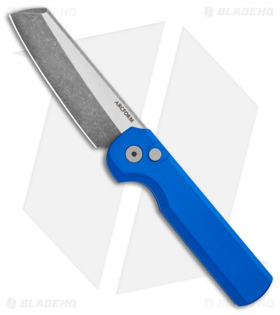 This Slimfoot Auto has a blue anodized aluminum handle and an acidwashed blade.