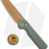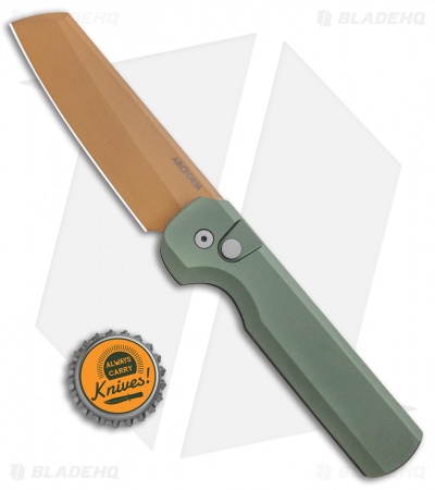 This Blade HQ Exclusive Slimfoot Auto Desert Warrior finish has an OD green anodized aluminum handle and a copper finished blade.