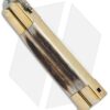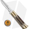 This knife has a beautiful Jody Samson deep hollow ground blade with sharpened swedge. It features brass handles and stag inlays. The blade is marked with the Bali-Song Butterfly logo on one side of tang and “BALI-SONG U.S.A.” on the other.