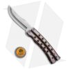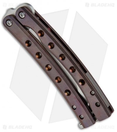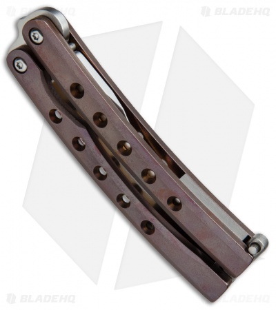 This custom butterfly knife from Balibalistic (Shawn Greacen) features textured titanium handles with a bronze/purple anodized finish. With a solid and balanced feel in hand, this custom balisong will take your flipping to a new level. Its unique stainless steel blade has deep hollow grinds and an impressive satin finish.