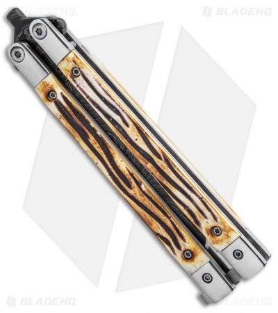 Bear Butterfly Knife w Stag Handle Damascus Blade (4″ Plain) 517D