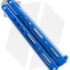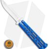 The Bear & Son 117R butterfly knife is built with durable blue epoxy coated zinc handles with a skeletonized design for reduced weight. It features a stainless steel blade with a satin finish and a single tang pin. This is a solid mid-range butterfly knife, made right here in the USA.