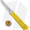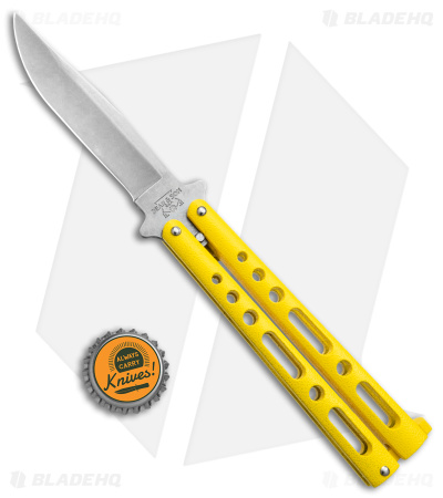 The Bear & Son 117R butterfly knife is built with durable yellow epoxy coated zinc handles with a skeletonized design for reduced weight. It features a stainless steel blade with a stonewash finish and a single tang pin. This is a solid mid-range butterfly knife, made right here in the USA.
