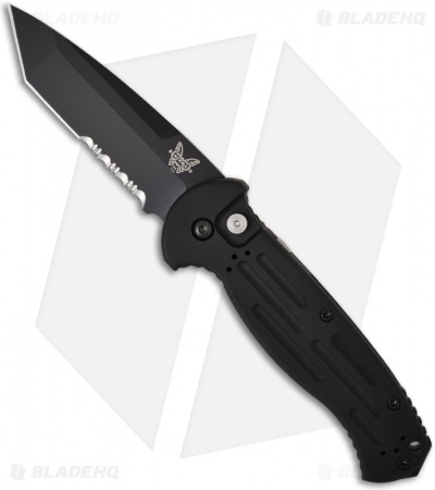 The AFO II 9052SBK has a black BK1 finished Tanto blade with a partially serrated edge. The handle is black anodized aluminum with a fully reversible pocket clip. Includes a ballistic nylon sheath with Malice clip.