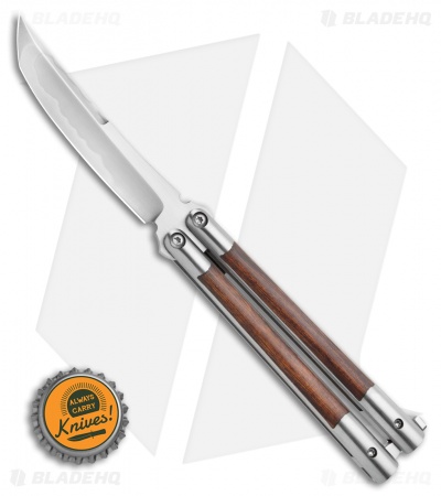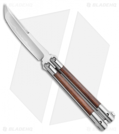This custom Kuma Gen4 balisong from Biegler Bladeworks has wood inlays and a Katana-style tanto blade made from W2 tool steel granting the beautiful Harmon finish.