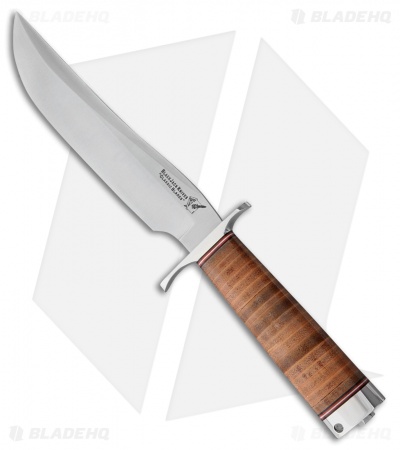 This BlackJack Knives Classic Model 3 features a tapered stacked leather handle with a polished guard and pommel. The blade is made with A-2 tool steel in a satin finish. The Model 3 comes with a brown leather belt sheath. Made in the USA.