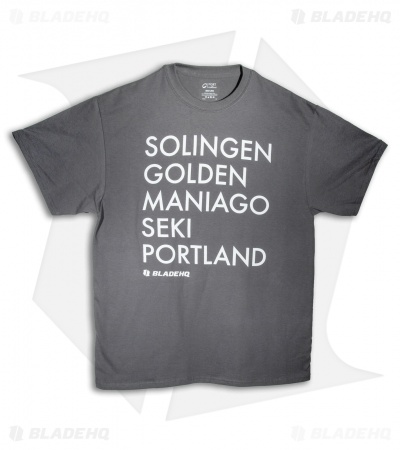 The Blade HQ Exclusive designed “Cities” shirt shows off your good taste in knives, and lists the famous cities where they’re crafted. This 100% cotton gray short sleeve t-shirt is available in a range of sizes. Choose your size from the drop-down menu above.