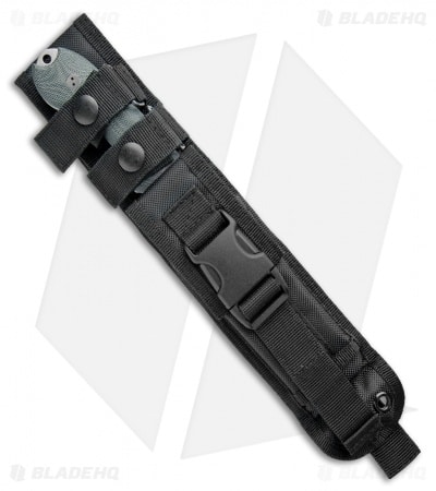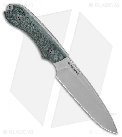 This Guardian5 knife has a CPM-3V steel blade with a sabre grind and stonewash finish. The handle is outfitted with 3D black micarta scales. Includes a nylon sheath.