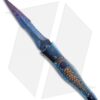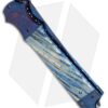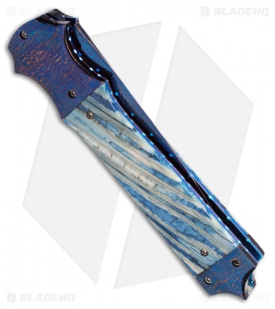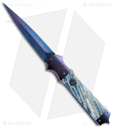 This custom Hasta automatic knife was handmade by Brandon Vallotton. It has Chad Nichols Frenzy pattern Damascus steel blade and bolsters. The dagger blade is hollow ground and has a single sharpened edge. The handle is blue mammoth molar, set atop the anodized titanium liner lock frame. The liners and polished stainless steel back spacer have been filed, adding to the overall feel and appearance of this fine knife. This knife includes a signed certificate of authenticity from the maker.