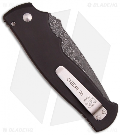 This Custom Brend M2 Automatic knife was picked up at the 2012 BLADE Show in Atlanta. It features a Damascus steel blade, hand-ground by Walter Brend. The black anodized aluminum handle features diamond back rattle skin inlays and push button insert. Action and lockup is top notch. Includes tip-up pocket clip marked with the Brend Flag logo, 06/12 and W. BREND. This is how knives should be made, the old school is back!