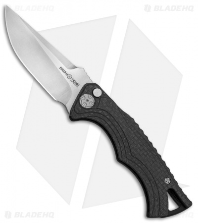 This Small Tighe Fighter automatic model has a bright stonewashed drop point blade and a ridged carbon fiber handle.