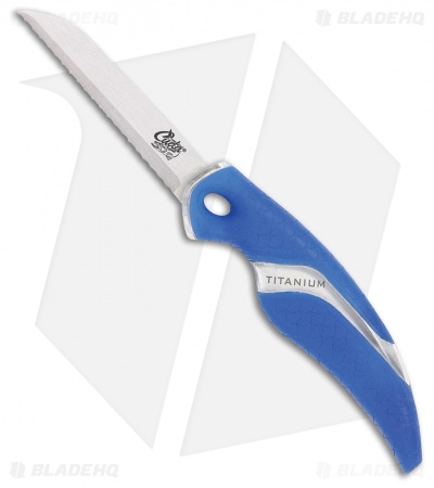 - Blue polymer handle with a non-slip Cuda scale pattern.