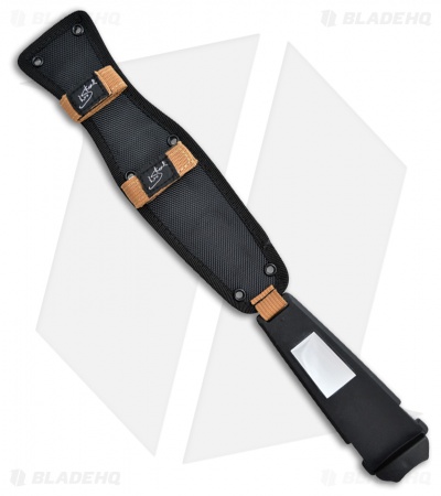 - Comes with a black hard ballistic nylon belt sheath with a signal mirror and fire starter.
