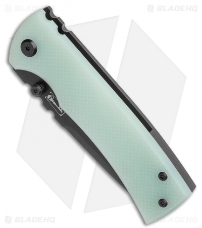 - Black titanium handle with a jade G-10 handle scale.