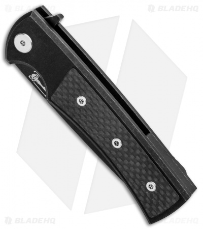 This Blade HQ Exclusive Liberation Street model has a blackout titanium handle with a carbon fiber inlay. Its blade is made from S35VN steel with a lightly tumbled black finish.