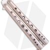The Chuck Gedraitis Balisong #61 has drilled titanium handles with blue anodized chamfer accents. Zen pins and stainless spacers. All surfaces are satin finished. The blade is 154-CM stainless steel and weehawk patterned. This butterfly knife doesn’t have bushings, but flips great.