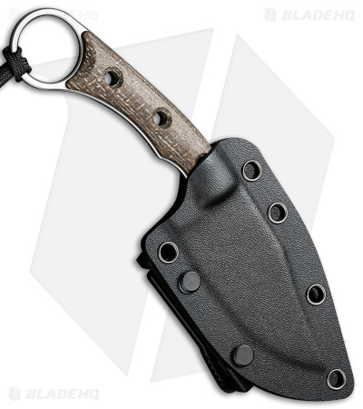 - Brown burlap micarta handle with a ring on the end of it.