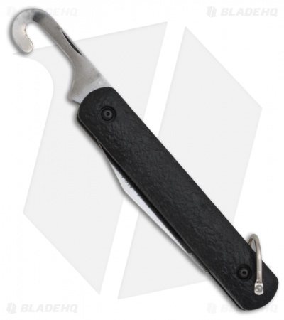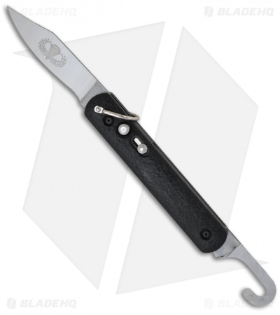 Automatic Rescue/Parachute Knife by Colonial Knife Company. The M-724 features a rescue hook and an automatic blade with a plain edge. It is made for use in emergency survival conditions. The M-724 consists of a hook belt cutter blade on one end and an automatic blade on the other end. The blade is opened by a release button and held in place with a slide lock while the rescue hook has a nail nick for opening. The steel is 1095 HC and the handle is black ISOPLAST with sliding safety and bail loop.
