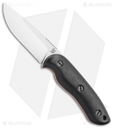 This Bushy fixed blade knife is outfitted with black micarta handles with orange liners. Its blade has a satin finish.