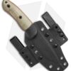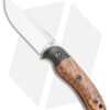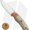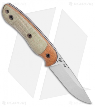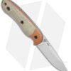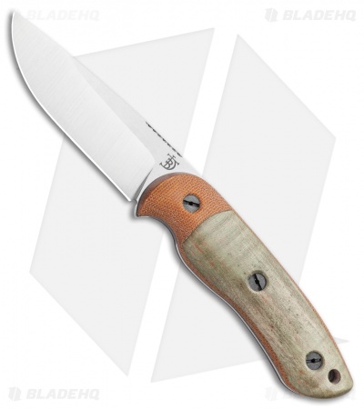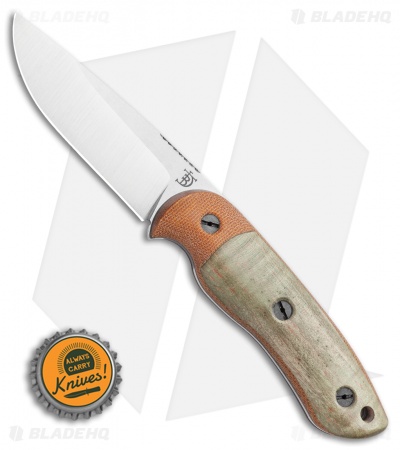 This Bushy fixed blade knife is outfitted with green curly maple and natural micarta handles with black liners. Its blade has a satin finish.