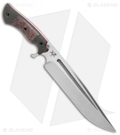 This Cave Bear fixed blade knife comes equipped with black maple burl inlays in the black and green micarta handle with red G-10 liners. Its blade has a two-tone finish.