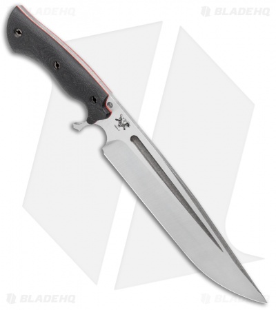 This Cave Bear fixed blade knife comes equipped with a black micarta handle and red G-10 liners. Its blade has a two-tone finish.