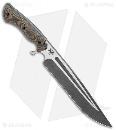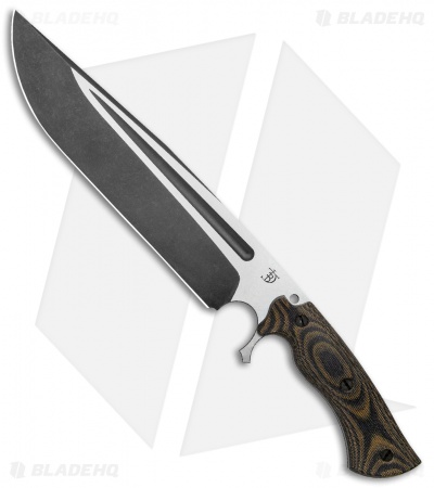 This Cave Bear fixed blade knife comes equipped with camo canvas micarta and black G-10 liners. Its blade has a two-tone acid etched finish.