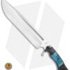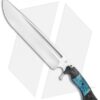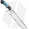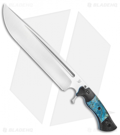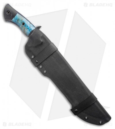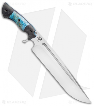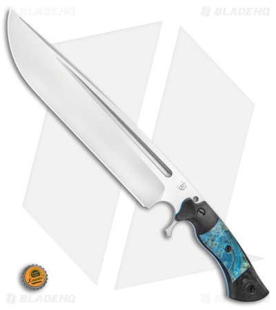 This Devil’s Horn fixed blade knife comes equipped with a black micarta handle and blue maple burl wood inlays with blue liners. Its blade has a two-tone finish.