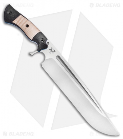 The Dark Timber Knives Devil’s Horn is one intimidating piece. This heavy duty blade gives off quite a menacing vibe as you unsheathe it with robust action. The 11.75″ drop point blade has a two-tone satin and stonewash finish with a well-defined blood groove. Its weight is nicely dispersed throughout the knife on account of the full tang construction. The handle is made with strong micarta and maple wood with stainless steel hardware.