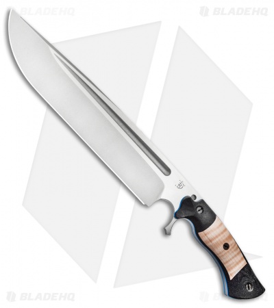 This Devil’s Horn fixed blade knife comes equipped with a black micarta handle and natural curly maple wood inlays with blue liners. Its blade has a two-tone finish.