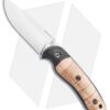 This Devil’s Horn fixed blade knife comes equipped with a black micarta handle and green maple burl wood inlays with red liners. Its blade has a two-tone finish.