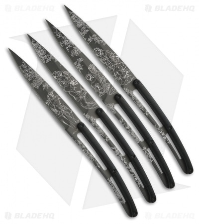 Deejo Toile de Jouy 9″ Ti Art Deco Steak Knives w/ Black ABS Handles – Set of 4