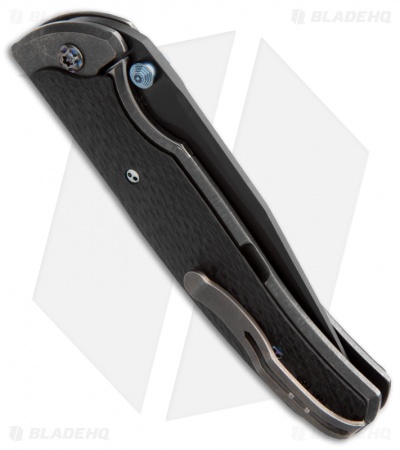This custom Diskin dual-action automatic knife from Matt is a very stylish, well-made piece. It has a black stonewash finished titanium frame and lock tab (with steel insert). The handle is dressed up with carbon fiber scales and a lighting strike carbon fiber back-spacer. The Elmax blade is black finished and sports thumb studs for opening. This dual action automatic knife is set up with a front scale release and the action is sweet and strong. The Diskin D/A comes complete with a steel tip-up pocket clip.