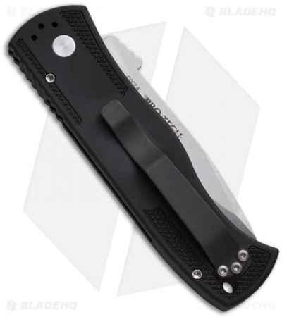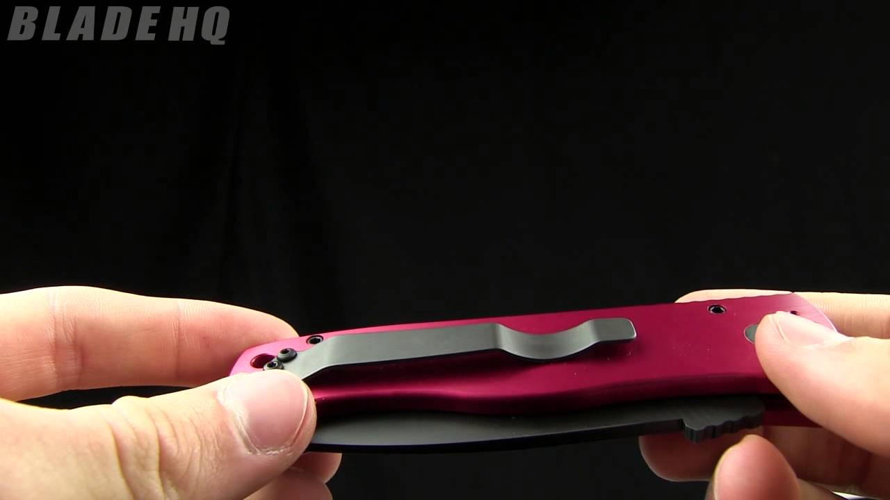 This knife features a black anodized aluminum handle with a knurl grip, safety and reversible tip-up/down pocket clip. The spear point blade is stonewash finished 154-CM stainless steel with a partially serrated edge.