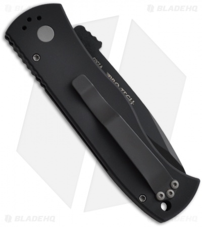 This knife features a black anodized aluminum handle with a smooth surface grip and reversible tip-up/down pocket clip. The spear point blade is black DLC finished 154-CM stainless steel with a plain edge.