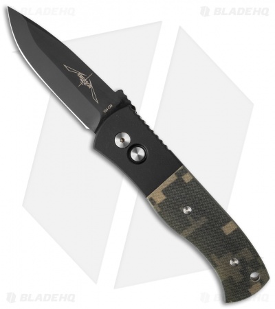 This CQC-7A automatic knife features a black anodized aluminum frame with camo G-10 inlays. The stainless steel spear point blade has a regular V grind and is black DLC finished. Includes a black tip-up carry pocket clip.