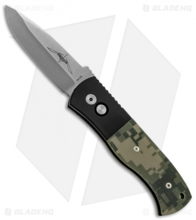 This CQC-7A automatic knife features a black anodized aluminum frame with camo G-10 inlays. The stainless steel spear point blade has a regular V grind and is stonewash finished. Includes a black tip-up carry pocket clip.