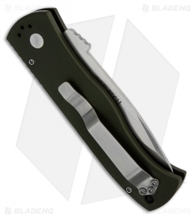 This knife features a green anodized aluminum handle with a smooth surface grip and reversible tip-up/down pocket clip. The spear point blade is stonewash finished 154-CM stainless steel with a plain edge.