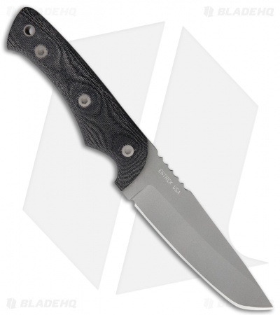 The EnTrek Otter is a sturdy fixed blade equipped with a 440C tanto blade and comfortable Micarta handle scales. This model has a gray finished blade and black Micarta scales. Includes a black Kydex belth sheath.