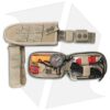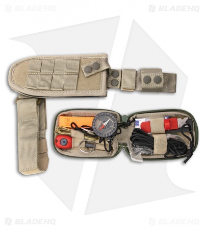 Starting with a 0.25″ stainless steel blade, the Selvans sports a wide tanto blade shape. Weighing in at almost a pound, chopping tasks are a breeze as the heft of the knife does all the work for you. Comfortable Forprene handles allow for serious work with relative ease. Carry the Selvans into the field with the ballistic nylon tan MOLLE compatible sheath. What survival knife is complete without an included kit? The Selvans doesn’t disappoint with the kit enclosed in a MOLLE pouch easily attached to the sheath.
