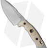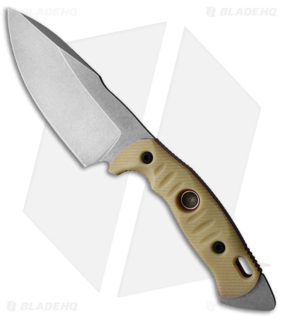 - Drop point stonewash blade with a thick tip.